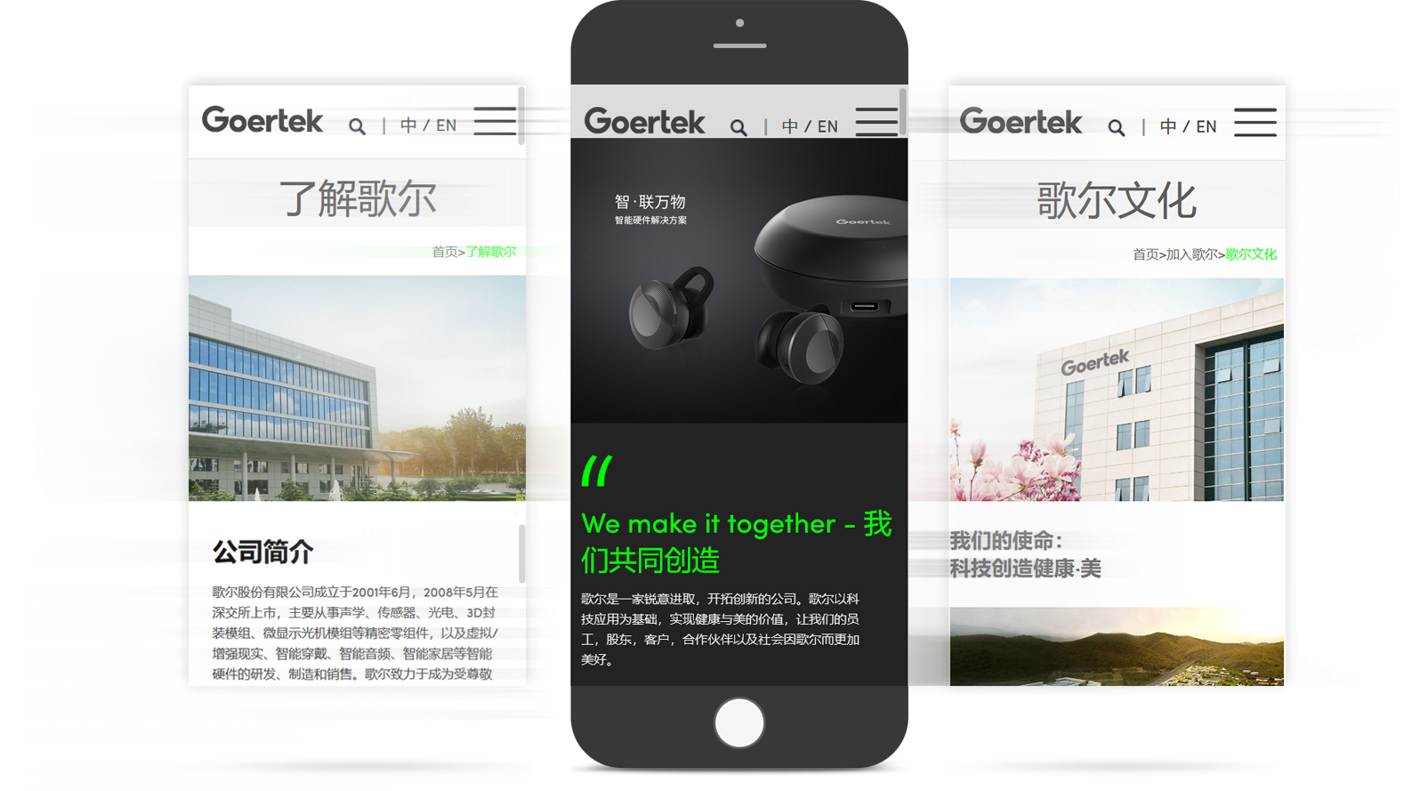 歌尔研发布局全球,在美国、日本、韩国、丹麦、北京、青岛、深圳、上海、南京、台湾等地分别设立了研发中心,以声光电为主要技术方向,通过集成跨领域技术提供系统化整体解决方案。 我们一起创造 We make it together