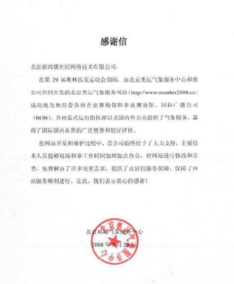 北京奥运气象服务中心在此次项目中看到了乐鱼平台_乐鱼(中国)一站式服务平台的实力和努力! 并对北京奥运会气象服务网站高度满意,特此发来表扬信,以示鼓励和赞扬!
