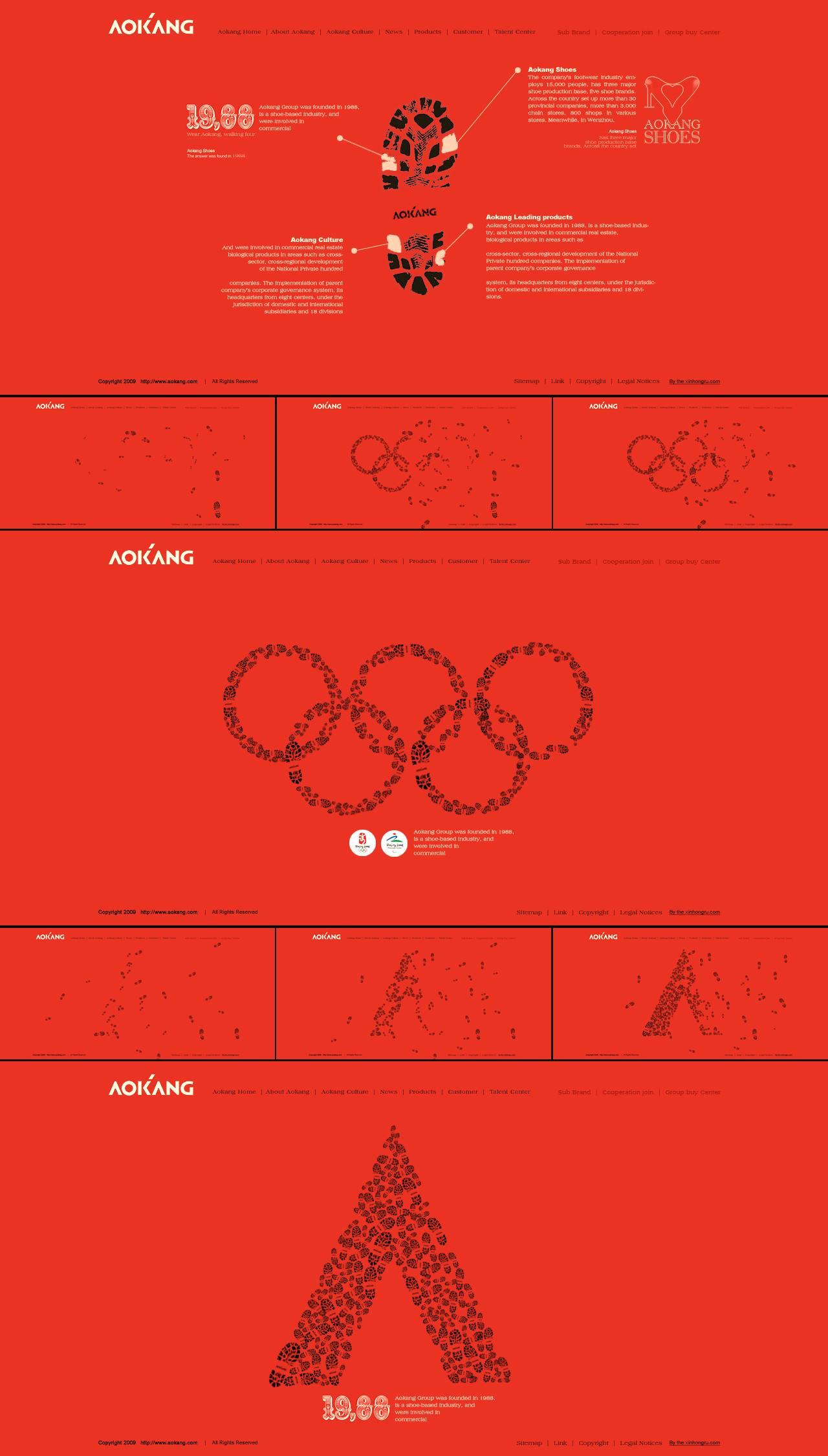 如图所示,乐鱼平台_乐鱼(中国)一站式服务平台根据奥康集团所在行业优势,将企业发展核心配合鞋印动态展示,生动直观;又结合奥康集团作为2008年奥运赞助商这一特征,以鞋印组成奥运五环,放大其奥运精神;最终,鞋印组合为奥康集团标志性logo,升华企业文化。
