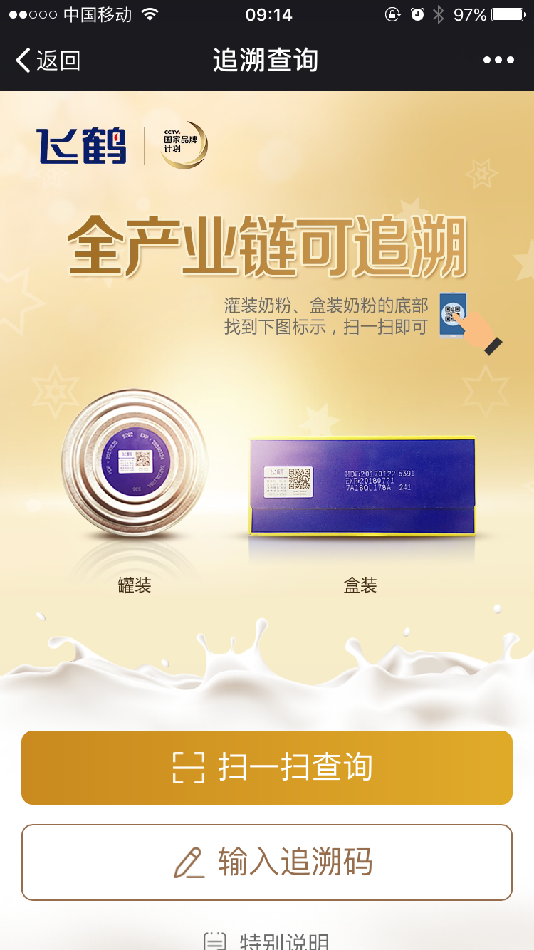 【产品追溯】对接产品生产系统,支持用户实时查询每一罐奶粉的出处,让宝宝喝得更放心,妈妈更安心。