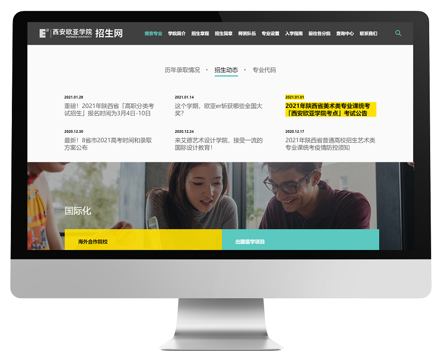 本次项目主要目的是通过对招生网站的升级,面对互联网环境下成长的全新一代准大学生进行品牌宣传,提升西安欧亚学院品牌形象、扩大品牌声量、最终提升招生工作。乐鱼平台_乐鱼(中国)一站式服务平台服务西安欧亚学院已有11年,为数字化校园系统提供迭代更新、系统升级、各平台系统的融合扩展工作,得到了院方各领导的高度认可与支持。
