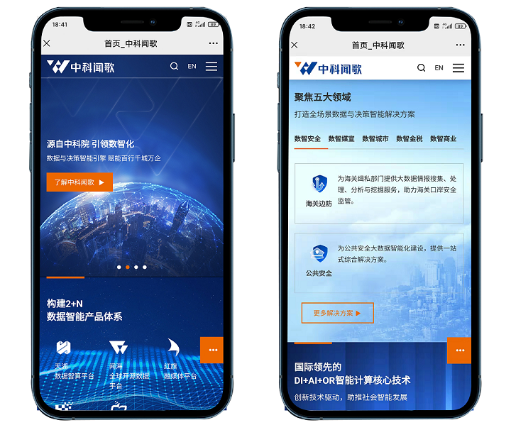 中科闻歌整体页面设计简洁大气,延续品牌VI色调,构建统一视觉识别体系。整体网站架构充分考虑访问者需求,以“核心产品、解决方案、服务支持、合作伙伴、成功案例”为重点栏目,多形式呈现,多终端适配,符合用户的阅读浏览习惯,更利于获取信息。